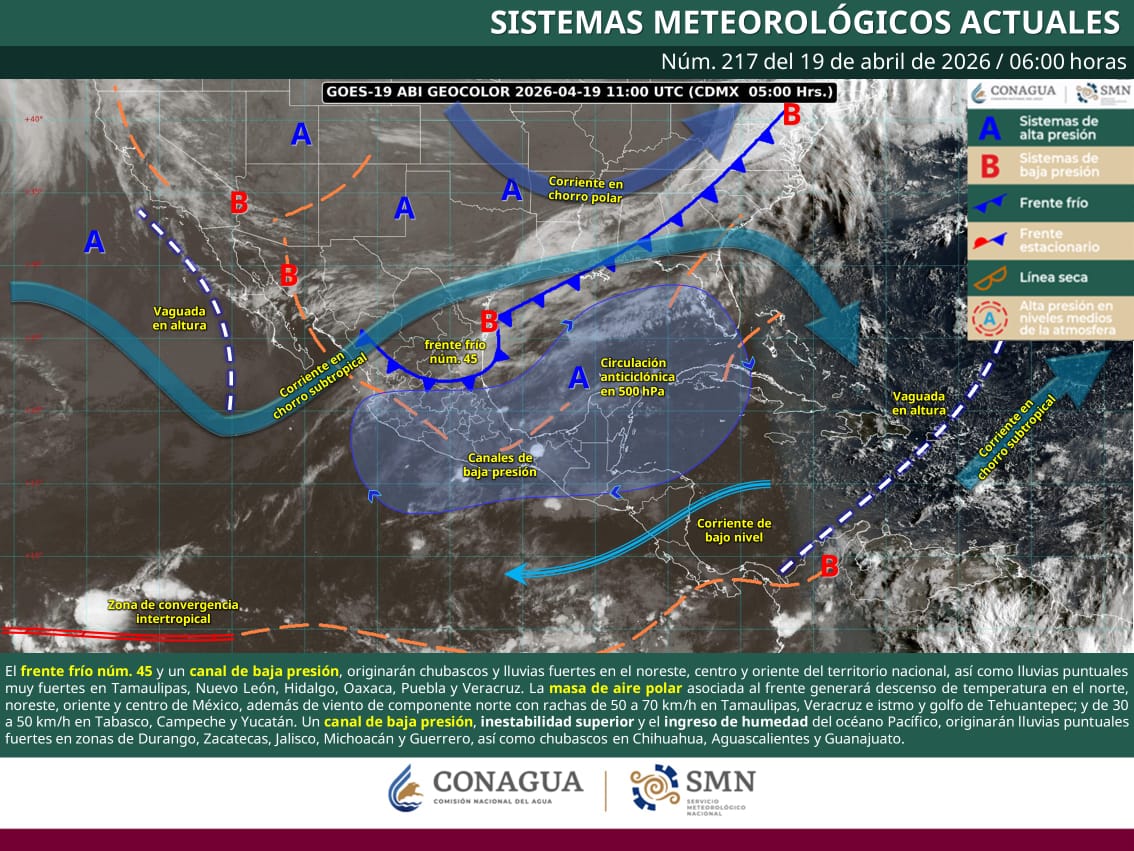 La Coordinación Estatal de Protección Civil y Gestión de Riesgos (CEPCyGR) informa que el frente frío número 45 se desplazará este día hacia el Golfo de México e interactuará con un canal de baja presión sobre el sureste del país, lo que ocasionará la formación de nubes de tormenta en el norte del Istmo, Sierra Sur, Mixteca y algunos sectores de la Costa.