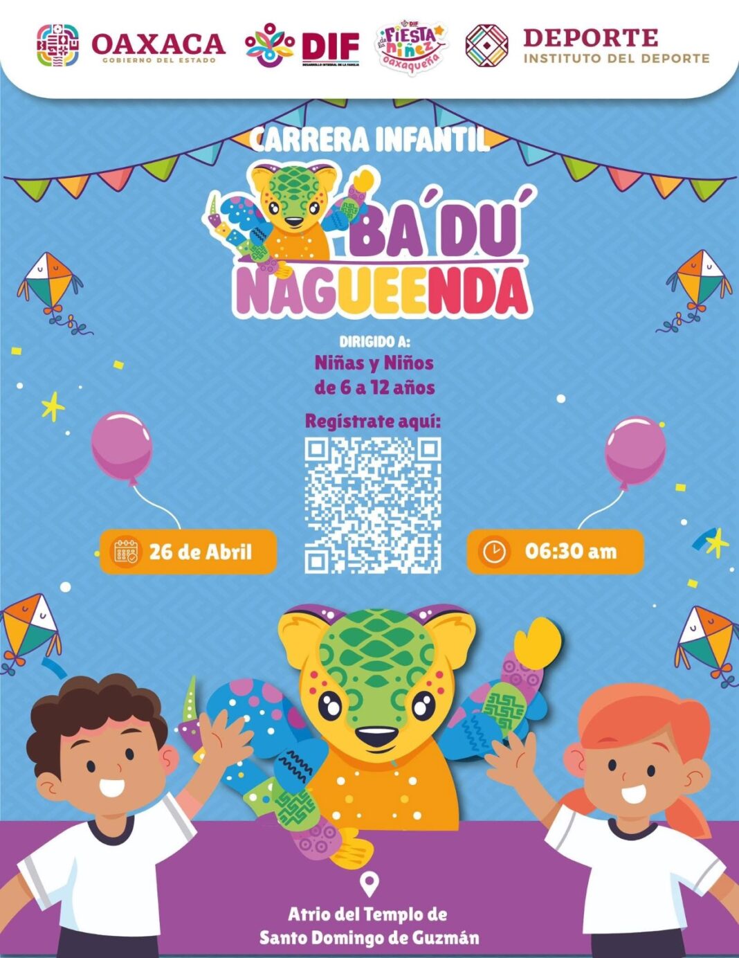 El Sistema para el Desarrollo Integral de la Familia (DIF) Oaxaca, en coordinación con el Instituto del Deporte del Estado (Indeporte), invita a niñas y niños de 6 a 12 años a participar en la carrera atlética infantil «BA´DU´NAGUEENDA», este 26 de abril a las 7:00 horas, en el atrio del Templo de Santo Domingo de Guzmán. 🏃🏽♀️🏃🏽