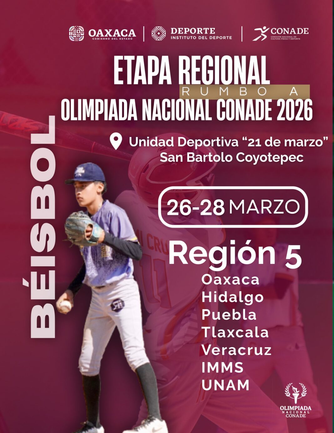 Oaxaca será la sede de la etapa Regional Nacional o Prenacional de Beisbol de la Olimpiada Juvenil Conade 2026, del 26 al 28 de marzo en los campos de la Unidad Deportiva “21 de Marzo” de San Bartolo Coyotepec serán el escenario de las acciones, confirmó el Instituto del Deporte del Estado de Oaxaca.