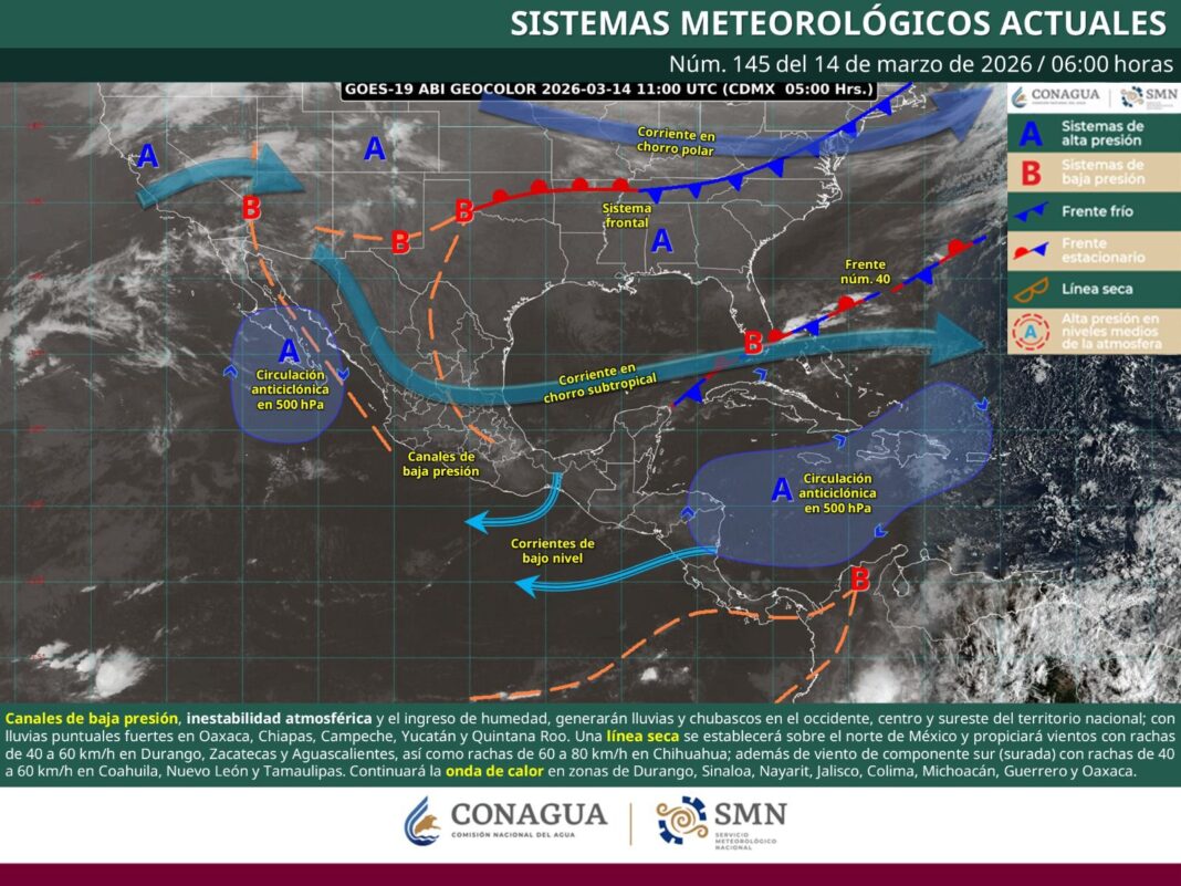 Asimismo, los vientos rolarán hacia el sur y sureste, lo que favorecerá una mayor sensación térmica asociada a la alta radiación solar durante la primera mitad del día. También se podrían presentar tolvaneras por la tarde, especialmente en zonas planas.