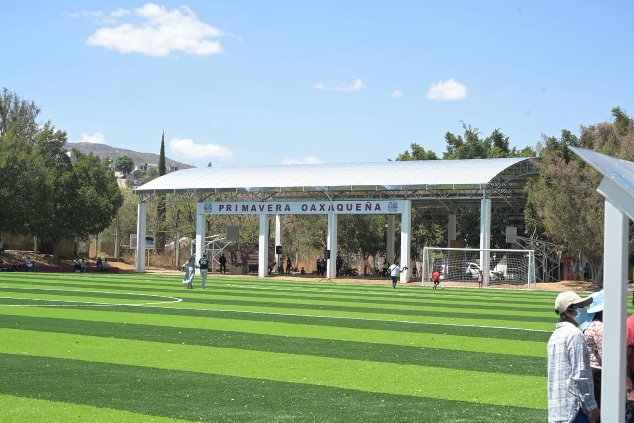 El gobernador Salomón Jara Cruz inauguró la cancha de futbol con pasto sintético y techado en la colonia Azucenas, agencia de San Martín Mexicapam de Cárdenas, perteneciente al municipio de Oaxaca de Juárez.