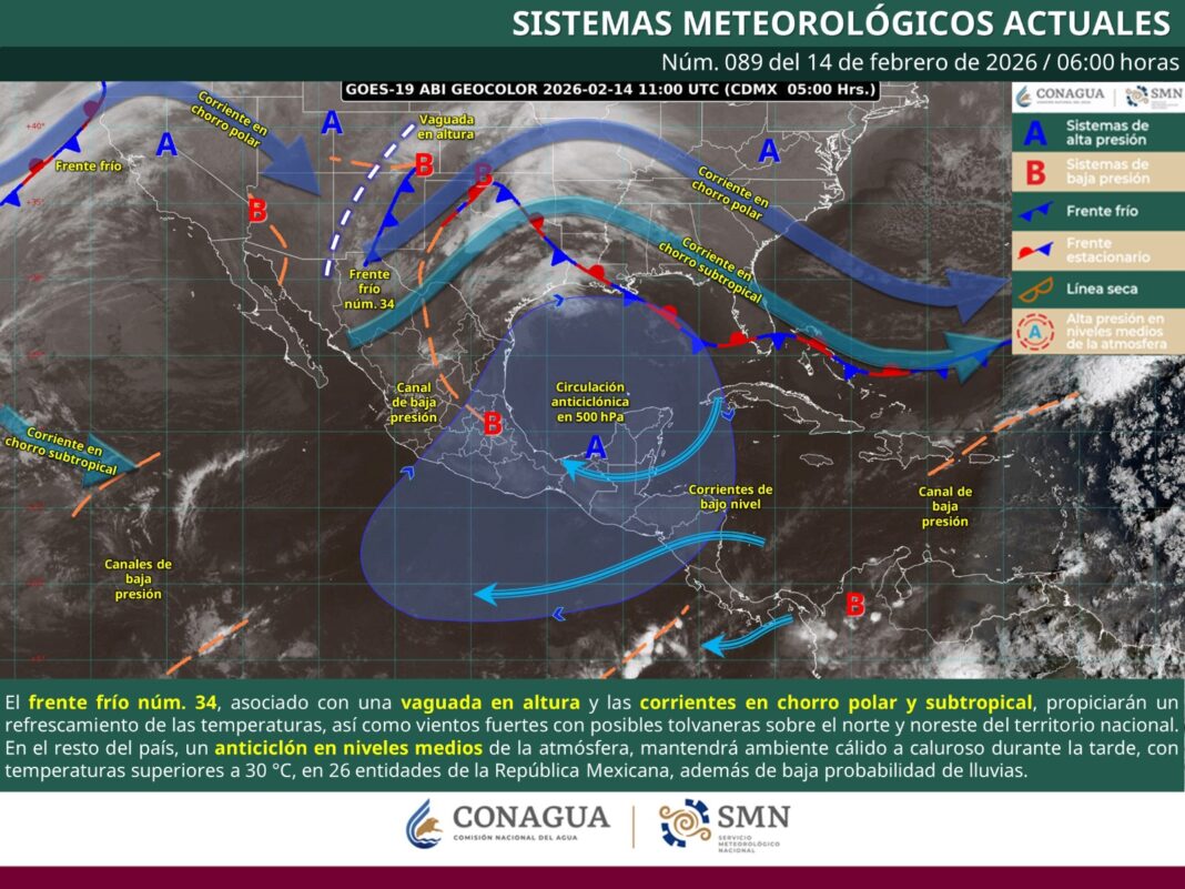 Asimismo, el frente frío número 34 se desplazará sobre el norte y noreste de la República Mexicana, por lo que se mantiene en vigilancia su evolución y posibles efectos indirectos en el estado.